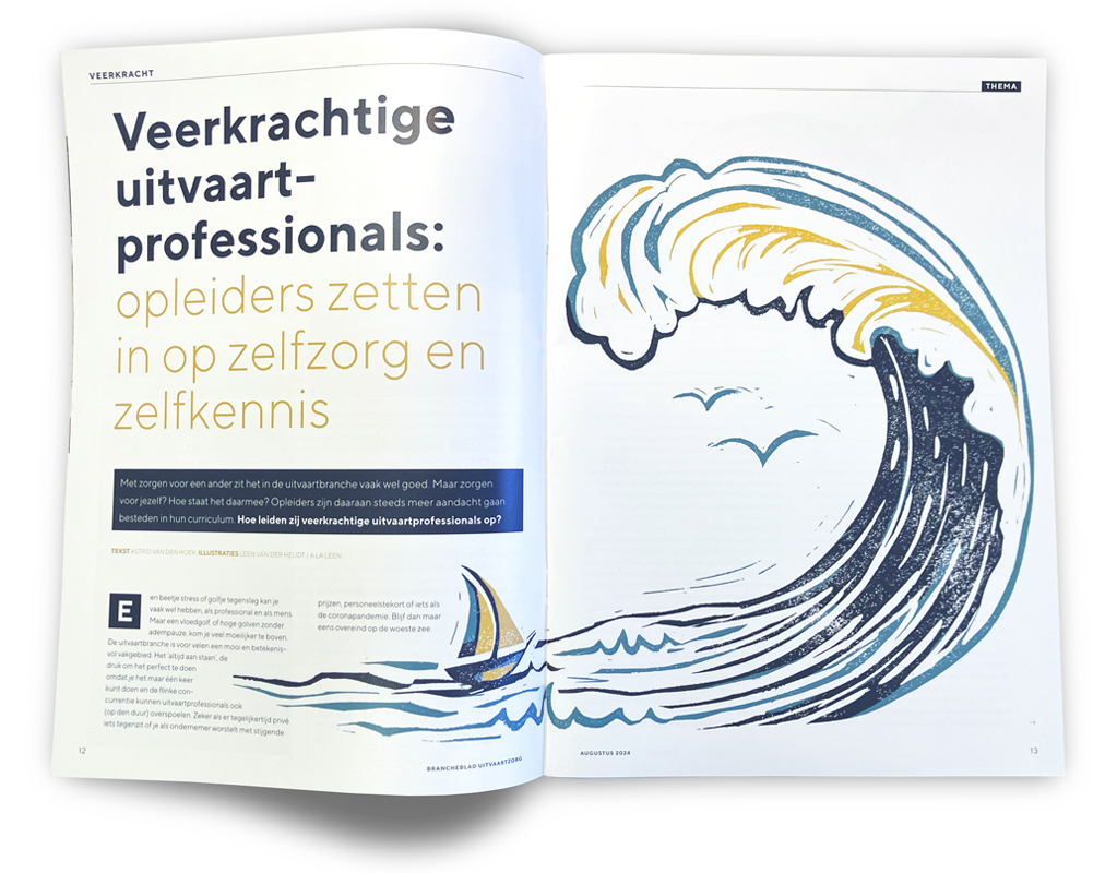 Als illustrator maak ik geregeld illustraties bij thema’s die complex zijn of moeilijk te vangen zijn in één beeld. Soms gebruik ik een metafoor om een gevoel over te brengen. Zoals hier bij de boot, de dreigende golf, het weer en het surfen.