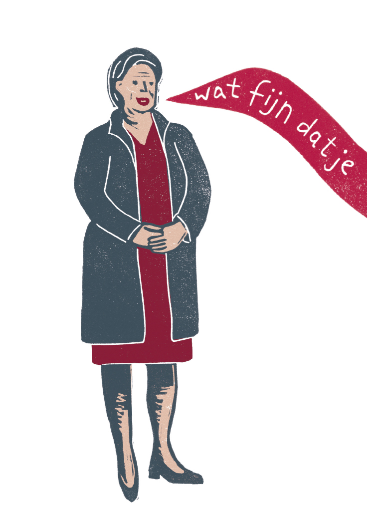 De illustratie loopt over vier pagina’s. De tekst gaat over wat taal kan doen en hoe troostend en verwarmend woorden kunnen zijn.