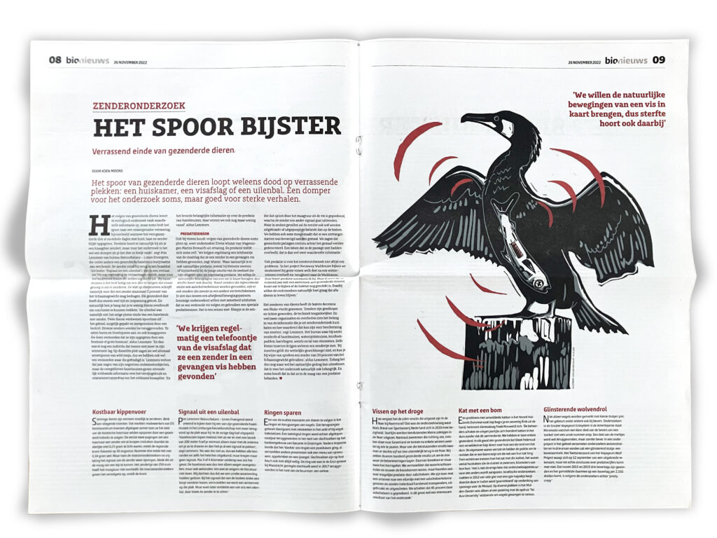 llustratie voor het artikel van Koen Moons in Bionieuws over de soms verrassende plaatsen waar onderzoekers zenders terugvinden.
