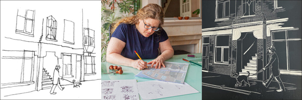 Als basis voor de illustraties maakte ik foto’s van verschillende portieken en van architect en liefhebber van portieken Marc Veliscek terwijl hij met zijn hond Dexter door de wijk wandelt. Marc’s enthousiasme over de portieken in de Bloemenbuurt was de aanleiding voor het artikel, speurtocht en wandeling door de wijk. Het leek mij daarom passend om hem met zijn hond al wandelend door de wijk te verbeeldden.